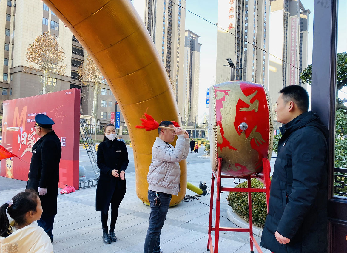 業(yè)主達(dá)到現(xiàn)場后,由工作人員接待并全程陪同。社區(qū)主大門,山河鼓韻響起,祥獅起舞,寓意業(yè)主吉祥如意、宅興人旺。